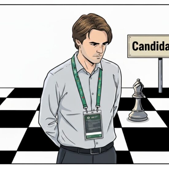 Die Spieler zeigen sich gut vorbereitet heute. Ding Liren spielt das Londoner System eine solide Spielweise, die sich angesichts ihrer Einfachheit beim Erlernen besonders bei Amateuren großer Beliebtheit erfreut. Dann passiert etwas. Der Inder weicht offenbar ab von der vom Chinesen vorbereiteten Variante und was vom Maschinenraum vorgeschlagen wird. Das ist normalerweise ein Zeichen einer etwas ungenauen Spielweise. Nicht dramatisch, aber ein Zeichen. Es folgt die längste Denkphase eines Spielers im bisherigen Match.