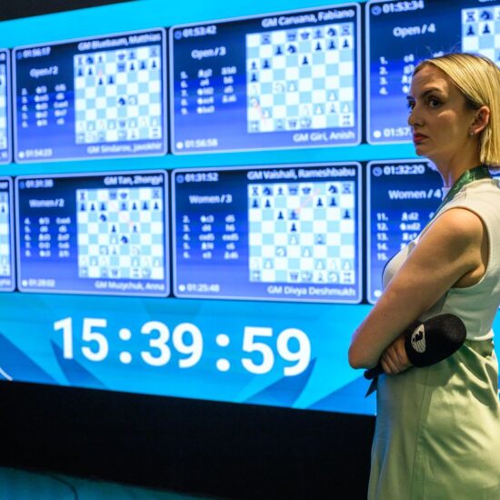 Der Pole hatte sich nach etwas mehr als vier Minuten für den aktiven Zug nach b8 entschieden. Jetzt ist sein Gegner dran. Dieser war 2022 bei der Schacholympiade noch im ersten indischen Team im Einsatz und hatte zuletzt etwas Rating abgegeben. Er dürfte hier vier bis fünf Züge erwogen und kurz angedacht haben – mit elf Minuten Restzeit. Eine erste schwierige Entscheidung bei knapper Bedenkzeit. Kandidatenzüge waren das Schlagen auf e6 mit Springer oder Dame. Das konnte in Kombination mit dem Schlagen auf e4 mit dem Springer (Läufer) erfolgen und ein prophylaktischer Zug mit dem König nach g2 (gegen den Turmzug nach b1 gerichtet) kam ebenfalls in Betracht.