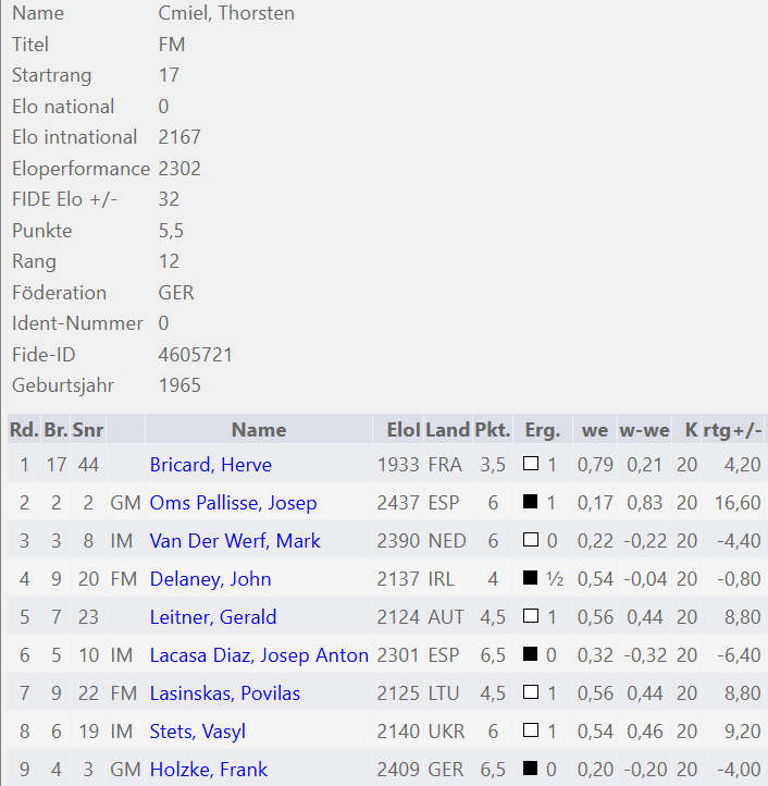 Durchschnittlich dauerten meine Partien fast fünfzig Züge, was ein guter durchschnittlicher Wert ist. Dafür muss man im Seniorenalter erst einmal die Kraft aufbringen. Bei mir ist der Trend insofern sehr positiv, da ich vor zwei Jahren noch gesundheitsbedingt in neun Runden oft vier schnelle Remis angestrebt habe. Schach ist ein Ergebnisspiel und seit der deutschen Meisterschaft im Seniorenschach 2024 in Bad Wildungen konnte ich mein Elozahl in 54 gewerteten Partien um 128 Punkte steigern und auf dem Weg dahin vier Internationale Meister und einen Großmeister schlagen. Der letzte Trend ist also ermutigend und bei der in Kürze beginnenden Weltmeisterschaft der Senioren im italienischen Gallipoli sollte ein Ratingpunkt drin sein, um meine Elozahl wieder über 2200 zu hieven. Das nächste Ziel danach ist meine Wiedereinstiegs-Elo aus dem Jahr 2017, die bei 2250 lag. In 2026 stehen allerdings mit Kandidatenturnier, Schacholympiade und Weltmeisterschaft drei Turniere an, die ich als Beobachter angehen möchte.