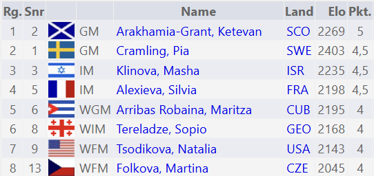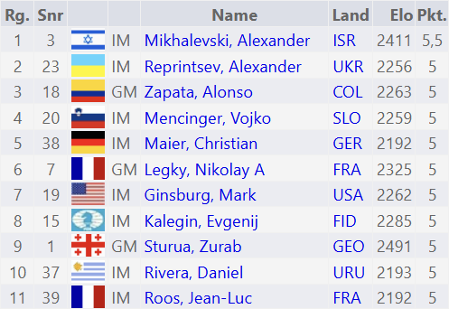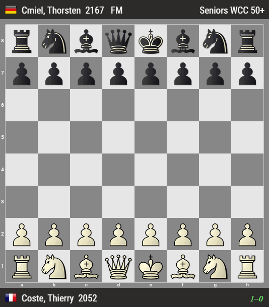 Bei der letzten Senioren-Weltmeisterschaft war zweimal Gold für die deutschen Spielerinnen und Spieler herausgesprungen. Beide Titelverteidiger legten diesmal allerdings eine Fehlstart hin und nur der Internationale Meister Christian Maier liegt bisher einigermaßen aussichtsreich im Rennen. Bisher gab es keine Gefangenen und fünf Siegen steht bei Christian eine Niederlage gegenüber.