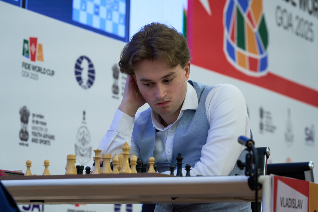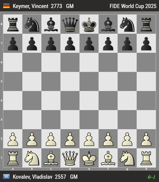 Der Gegner von Vincent in der zweiten Runde des diesjährigen World-Cup in Goa (Indien) – zur ersten Runde mussten Spieler in der Vincent-Klasse nicht ran – hieß Vladislav Kovalev. Dieser tritt unter FIDE-Flagge an und stammt ursprünglich aus Belarus. Seine beste Elozahl erreichte Vladislav im Jahr 2019 mit 2703, aber danach ging es stetig bergab. Über die Ursachen ist wenig bekannt, er soll in Batumi leben. Seine letzte Elo-gewertete hatte Kovalev jedenfalls lange Zeit vorher gespielt, bei der Europameisterschaft 2024 in Petrovac, fast ein Jahr zuvor.