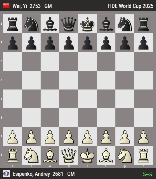 Die erste Partie im Stichkampf verlief recht ereignislos. Sie folgte zunächst den Bahnen aus der klassischen Partie. Erst im zehnten Zug (10.h3) kam es zu einem neuen Zug durch den Russen und stellte den Chinesen nicht vor allzu schwierige Aufgaben, schien es. Hinten heraus konnte Wei Yi nach einem Fehler seines Gegners sogar mehr rausholen, verpasste aber seine Chance und gab sich mit einer dreimaligen Stellungswiederholung zufrieden.