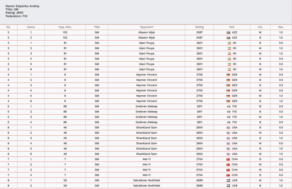 Wie in der ersten Partie zog der Usbeke einen Läufer nach d5, diesmal schlug er sogar einen Bauern und erneut war das ein schlechter Zug. Danach lief es für den Russen wie auf Schienen. Er benötigte nur noch einige präzise Züge und die fand er diesmal, scheinbar leicht. Alle verbliebenen vier Spieler zeigen bisher eine gewisse Erschöpfung und Esipenko meinte, dass er sich zwei Monate erholen müsse. Danach dürfte die Vorbereitung auf das Kandidatenturnier beginnen.