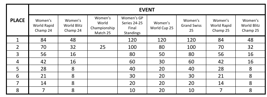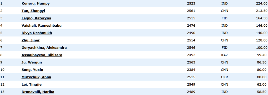 Der aktuelle Stand beim letzten Qualifikationsplatz sieht im Frauen-Circuit so aus. Die erste Spielerin, die noch nicht qualifiziert ist für das Turnier der Kandidatinnen auf Zypern ist die Kasachin Bibisara Assaubayeva. Zur Einordnung: Ein erster Platz bei der Schnellschach-WM der Frauen brachte der Siegerin 84 Punkte. Die Siegerin im Blitz, Ju Wenjun, erhielt 48 Punkte. Das ist auch diesmal so. Die ersten acht Spielerinnen erhalten Punkte.