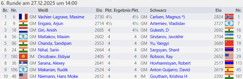 Die Paarungen für die sechste Runden sind bereits kurz nach Spielschluss bekannt. Die Paarungen an den ersten zehn Brettern sind sicher noch nicht aussagekräftig, aber geben einen ersten Hinweis wer am Ende vorne landen könnte.