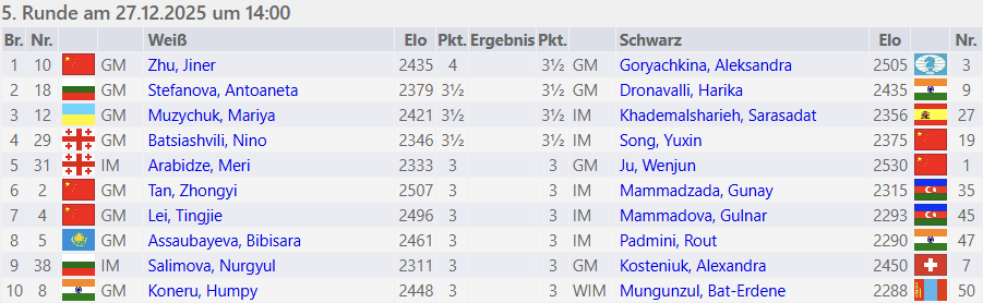 Bei den Frauen ergibt sich die Spannung aus dem noch offenen Platz im Turnier der Kandidatinnen auf Zypern Ende März 2026. Harika Dronavalli liegt bisher aussichtsreichsten, aber der Kampf dürfte spannend werden. Nicht unterschätzen sollte man neben der Kazachin Assaubaeva die Chinesin Yuxin Song, die etwas besser als ihre Landsfrau Lei Tingjie positioniert ist.