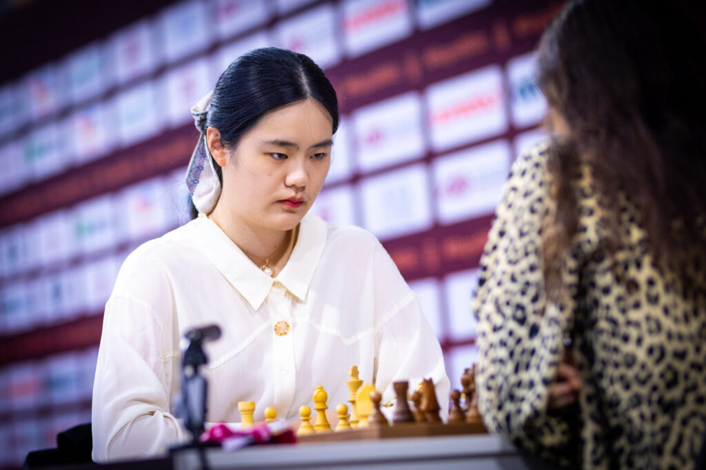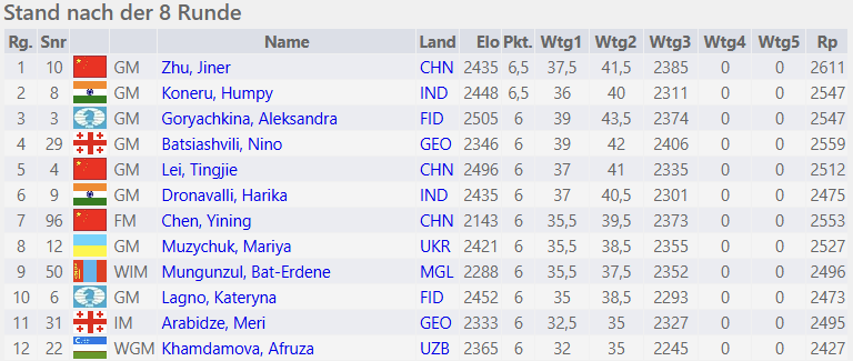 Die beiden führenden Spielerinnen sind beide bereits für das Turnier der Kandidatinnen qualifiziert. Einen halben Punkt zurück erscheint ein alleiniger Sieg einer Außenseiterin unwahrscheinlich. Daher konzentrieren wir uns auf die anderen Spielerinnen mit sechs Punkten, die gegenüber Bibisara Assaubaeva (wie Ju Wenjun nur 4.5 Punkte) aufholen könnten. Die zwei Russinnen Goryachkina und Lagno sind ebenfalls irrelevant für diese Überlegungen. Lei Tingjie (62.00) hat aktuell die besten Chancen näher an die Kasachin (99.40) zu rücken als Harika Dronavalli (58.50), die in einem Turnier einen halben Punkt besser abschneiden muss als die Chinesin. Momentan ist es wahrscheinlich, dass über den Qualifikationsplatz erst im Blitzturnier entschieden wird. Ein geteilter erster Platz wäre ein wichtiger Schritt für die Chinesin oder die Inderin. Beide Spielerinnen haben noch keine einzige Partie verloren und könnten in einer der Schlussrunden gegeneinander spielen.