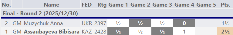 Die Paarungen sahen Bibisara Assaubaeva zunächst gegen Zhu Jiner vor. Anna Muzychuk war Favoritin gegen die Niederländerin Eline Roebers. Das war eine erste wichtige Weichenstellung, denn Anna hätte durch einen Sieg gegen die Kazachin ihre eigenen Chancen für das Erreichen des Turniers der Kandidatinnen verbessern können. Bibisara gewann ihr Match deutlich und sicherte sich die erhoffte Qualifikation frühzeitig. Assaubaeva löste also das Ticket als 8. Kandidatin. Das zweite Halbfinale verlief spannender und wurde erst in der vierten Partie entschieden.