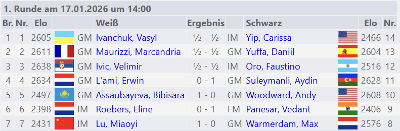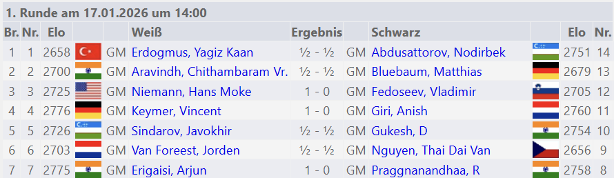Ein Turnier mit 14 Teilnehmern zu verfolgen ist keine einfache Angelegenheit. Am besten sucht man sich einige Spielerinnen und Spieler raus, denen man folgen und mit denen man mitfiebern kann. Oft sind das landsmannschaftliche Vorlieben. Die meisten Teilnehmer stellen traditionell die Inder – Tata Steel als Hauptsponsor ist ein indisches Unternehmen und stellt daher immer ein größeres Kontingent an Spielern und niederländische Spieler sind natürlich ebenfalls prominent vertreten. Als Deutscher kann man sich natürlich dem Fokus auf die zwei aktuell erfolgreichsten Spieler Vincent Keymer, der erstmals in Wijk als Favorit im Masters an den Start geht, und Matthias Blübaum, der in einigen Wochen das Kandidatenturnier spielt, kaum entziehen. Zudem ist es natürlich eine spannende Frage wie die Frühform der Kandidaten aussieht. In der ersten Runde verloren sogar zwei Kandidaten ihre Auftaktbegegnungen und der Usbeke Javohir Sindarov stand kurz vor einer Niederlage. Für deutsche Fans zeigte Matthias Blübaum eine ansprechende und fehlerfreie Leistung mit Schwarz und remisierte ohne größere Probleme. Vincent Keymer gewann seine Partie gegen Anish Giri nach einem überraschenden Kollaps seines Gegners. Netter Start.