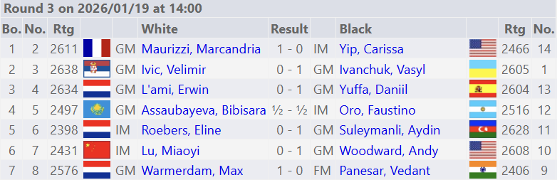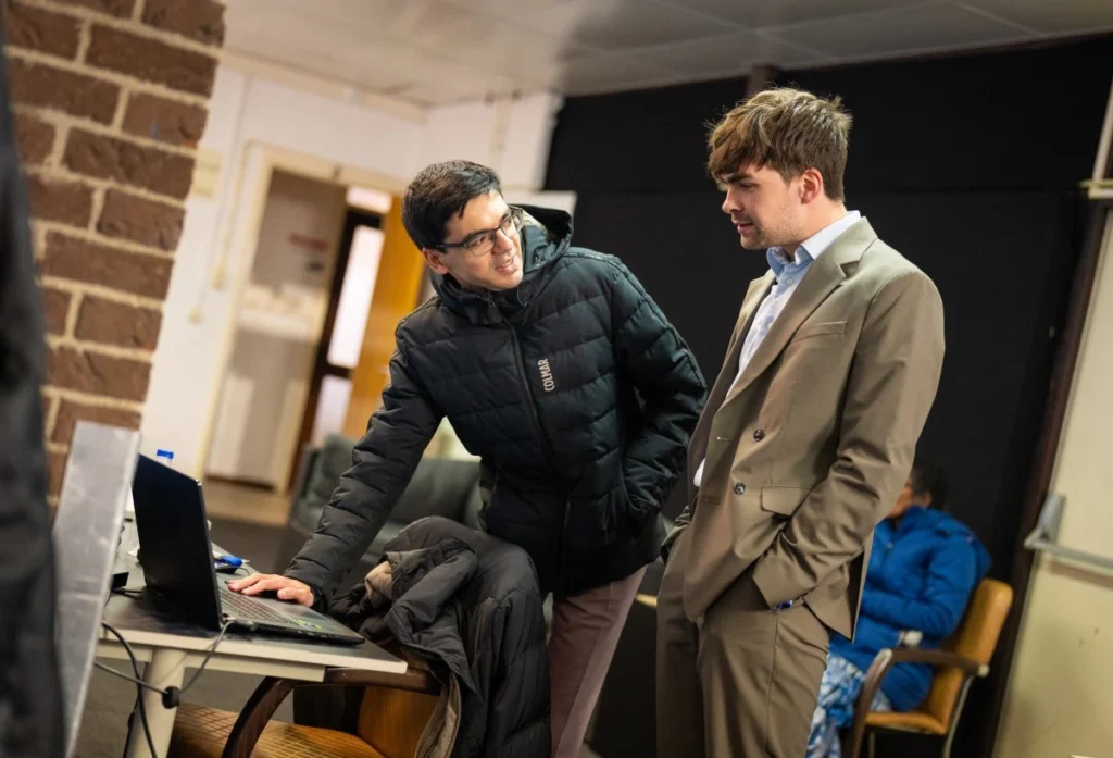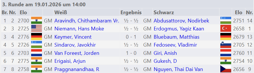 Die zwei Kandidaten Anish Giri und Praggnandhaa sind beide mit einem halben Punkt aus drei Partien fehlgestartet. Insbesondere der Niederländer wirkte in seinen bisherigen Partien unaufmerksam. Der Niederländer scheint seinen bisher eher schwachen Auftritt leicht zu nehmen, zumal die Partie der dritten Runde phasenweise von Giri hervorragend gespielt wurde. Vielleicht hilft ihm das Wissen darum, dass der US-Großmeister Fabiano Caruana vor dem Gewinn des Kandidatenturniers in 2018 ein schlechtes Turnier in Wijk spielte (5.0 Punkte aus 13). Damals gewannen Giri und Magnus Carlsen mit neun Punkten.