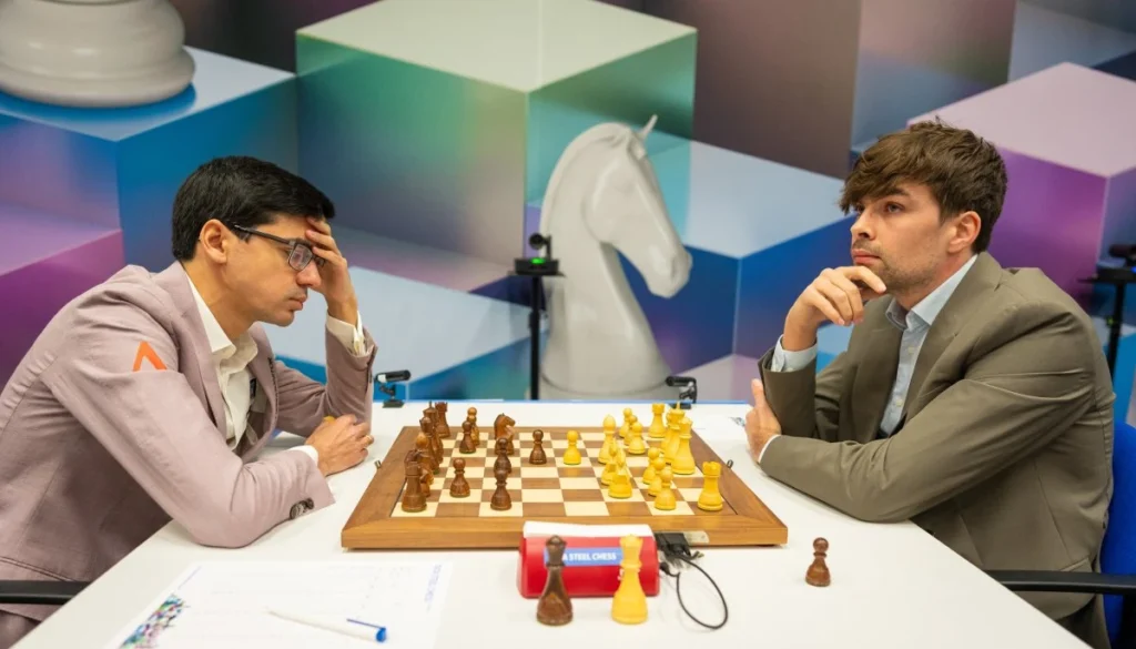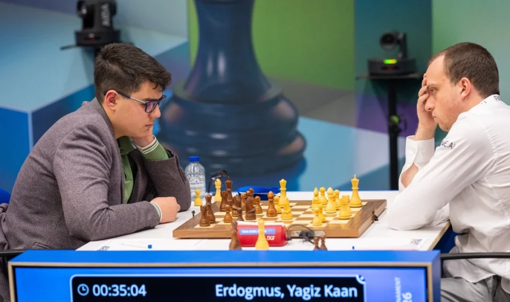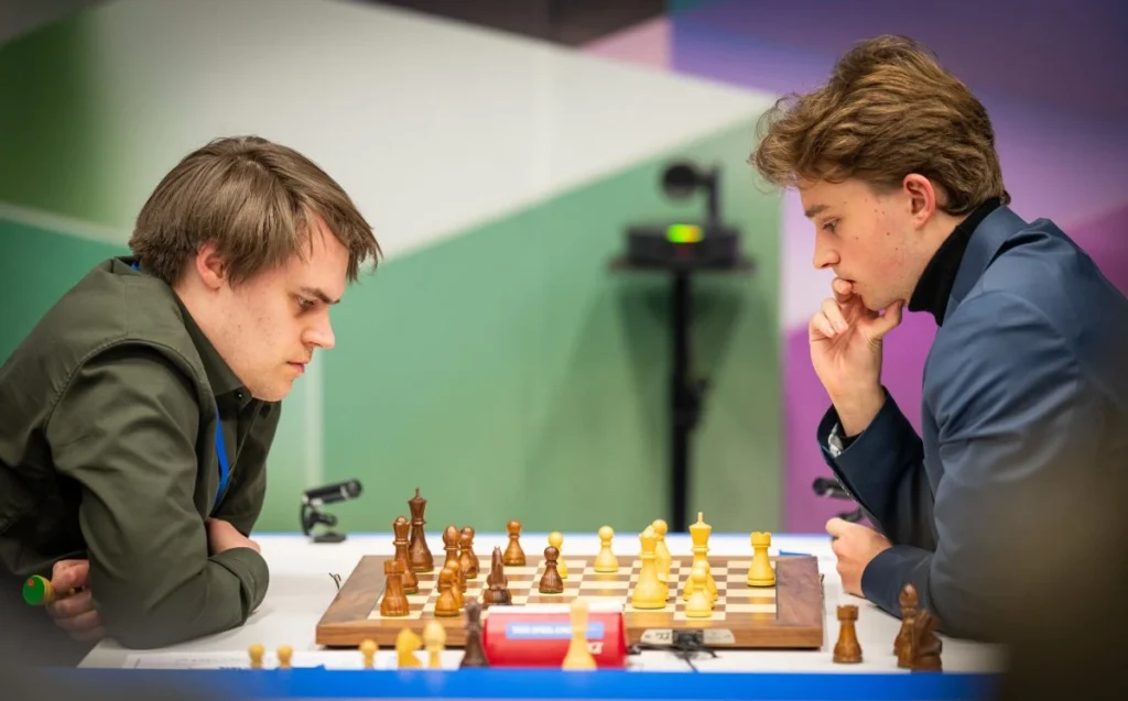 Im deutschen Duell betraten beide Spieler in der Abtauschvariante des Damengambits zunächst sehr solide Pfade. Es sah früh nach Damentausch und einem Positionskampf im damenlosen Mittelspiel aus. Vincent Keymer verfolgte jedoch ehrgeizigere Pläne und hatte zuletzt seinen h-Bauern ein Feld nach vorne geschoben.