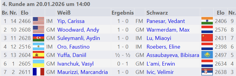 Im Duell der Kandidaten gewannen der Usbeke Javokhir Sindarov gegen Matthias Blübaum mit einem taktischen Ausrufezeichen. Nodirbek Abdusattorov punktete gegen Thai Dai Van Nguyen und ser US-Amerikaner Hans Niemann zeigt sich bisher in guter Form. Im Challengers-Turnier gab es erneut sechs entschiedene Partien. Dort führt der Aseri Aydin Suleymanli mit 3.5 Punkten.