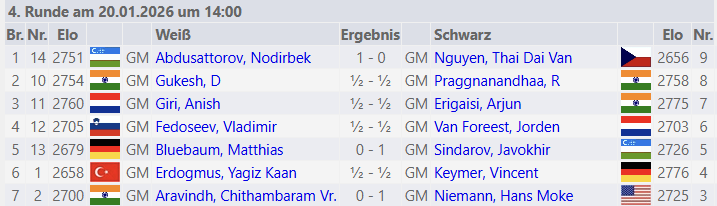 Herausragend war der Sieg von Hans Niemann gegen den Inder Aravindh Chitambaram aus Chennai. Die Partie könnte als Musterpartie beim Ausnutzen gegnerischer Ungenauigkeiten herangezogen werden. Die anderen entschiedenen Partien steuerten diesmal die zwei Usbeken bei. Nodirbek Abdussattorov hatte lediglich eine kurze Schwächephase gezeigt, aber ansonsten eine starke Leistung gezeigt. Matthias Blübaum reihte sich in die teilweise absurd erscheinenden Niederlagen im Masters 2026 ein. Tragisch war wieder mal der Verlauf in der Partie von Arjun Erigaisi, der Anish Giri bereits am Haken hatte, aber dann im Endspiel einen kurzen Moment unaufmerksam war. Die Begegnung von Pragg und Gukesh hielt diesmal nicht was man sich von der Chennai-Stadtmeisterschaft versprechen konnte und endete im Dauerschach. Vincent Keymer konsolidierte mit seiner Schwarzpartie.