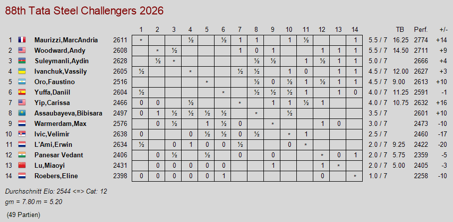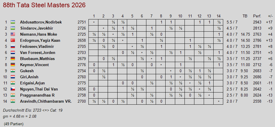 Die siebte Runde brachte einige weitere bemerkenswerte Ergebnisse. Der junge Türke Yağız Kaan Erdoğmuş überzeugte in den ersten sieben Runden vollends und liegt nach seinem Sieg gegen Arjun Erigaisi im Verfolgerfeld. Vincent Keymer weicht einer dreifachen Stellungswiederholung aus und verliert gegen den Dominator von Wijk, Nodirbek Abdusattorov. Anish Giri ist zurück mit einem Sieg gegen Gukesh. Nach seiner Niederlage am Tag zuvor zeigt auch Jorden Van Foreest eine überzeugende Leistung und gewinnt gegen den Inder Aravindh.