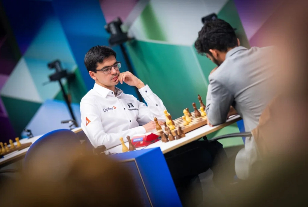 Anish Giri gewinnt seine erste Partie im Turnier und bringt gleichzeitig Gukesh in eine erste Minikrise. Vielleicht hat der grobe Fehler vom Tag zuvor seine Spuren hinterlassen. Beide Spieler liegen bei einem Minus-Eins-Score.