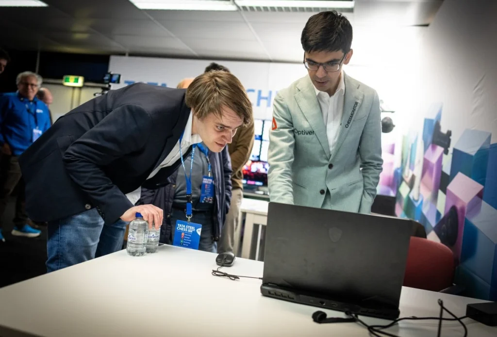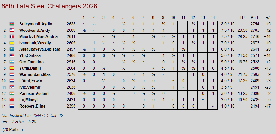Der deutsche Kandidat punktet zunächst gegen Gukesh und diesmal gegen Anish Giri. Der indische Weltmeister spielt weiter Ergebnis-Ping-Pong und Vincent kommt ebenfalls mit einem Sieg zurück. Bei dem Challenger-Turnier gibt es einen Führungswechsel nach einem Sieg von Vassily Ivanchuk gegen Woodward. Jetzt liegt der Aseri Aydin Suleymanli vorne.