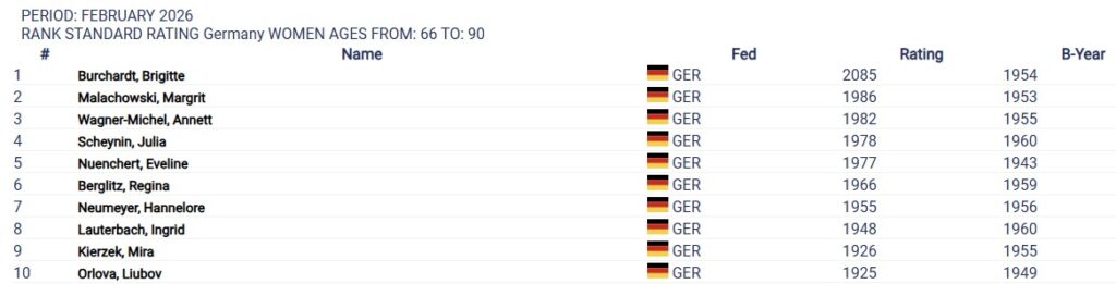 Aufmerksame Leser werden sofort erkennen, dass die Frauen im Nachteil bei der Förderung sind. 2200 als Durchschnitt für die Frauen 50+ ist nicht ganz einfach zu erreichen, aber möglich wenn eine oder zwei Spielerinnen der ersten Drei der Top10 50+ antreten wollen. Bei den Frauen 65+ müssten Spielerinnen anderer Nationen unter deutscher Flagge antreten, denn die beste deutsche Spielerin, immerhin Weltmeisterin 2024, kann die durchschnittlich geforderte Elozahl nicht aufbringen. Ein Team ist also theoretisch gar nicht möglich.