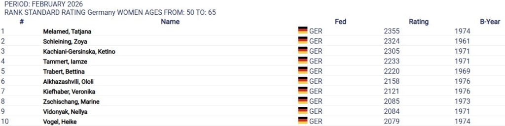Für Frauen-Mannschaften der Kategorie 50+, die unter dem Namen Germany starten, wird das Startgeld vom DSB übernommen, wenn die durchschnittliche Elo-Zahl der Mannschaft am 1.1.2026 mindestens 2200 beträgt.