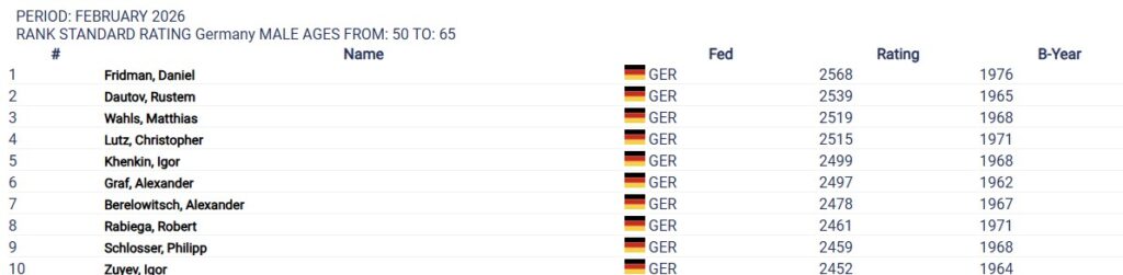 Ich habe mir daraufhin mal die Elozahl der besten zehn Spielerinnen und Spieler der jeweiligen Altersgruppe im Februar 2026 (macht keinen Unterschied) angesehen, da ich spontan keine Teams zusammenstellen konnte in allen Altersklassen. In der offenen Klasse sind starke Teams denkbar und es wäre erfreulich solche Teams bei der Senioren-Team-WM zu sehen.