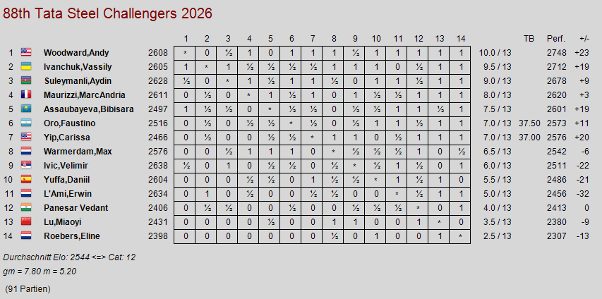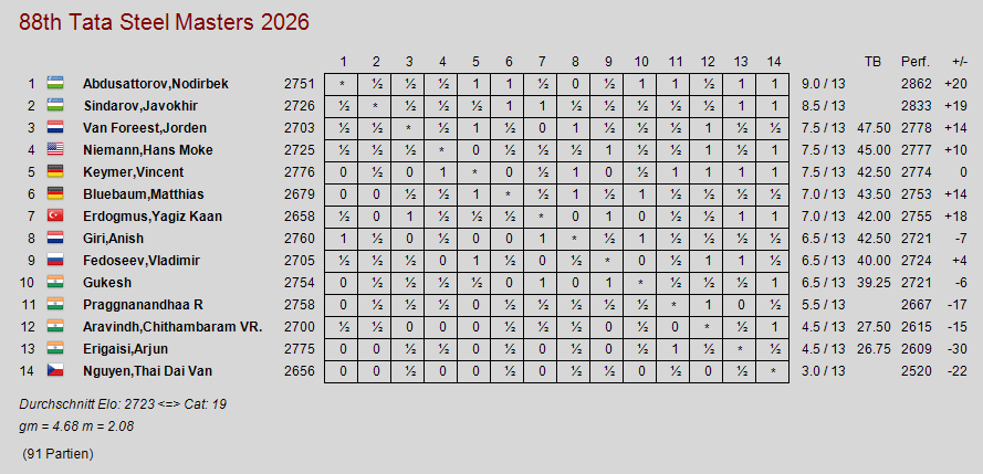 Der Inder Arjun Erigaisi kommt mit dem Turnier in Wijk in der Regel nicht zurecht und anders als Gukesh, der auch 2026 wieder großen Kampfgeist zeigte, hatte man bei Arjun und Pragg am Ende des Turniers das Gefühl, dass die beiden Inder keine echte Gegenwehr aufbauen konnten. Nodirbek Abdusattorov zeigte erneut eine starke Leistung und gewann scheinbar problemlos mit Schwarz gegen den Inder. In der Partie von Sindarov gegen Nguyen passierte Einiges und es sah lange nach einem Unentschieden aus. Dann folgte ein weitere chaotische Zeitnotphase. Die Kraft reichte für den tschechischen Großmeister nicht aus und ihm unterlief erst spät in der Partie dann ein spielentscheidender Fehler..