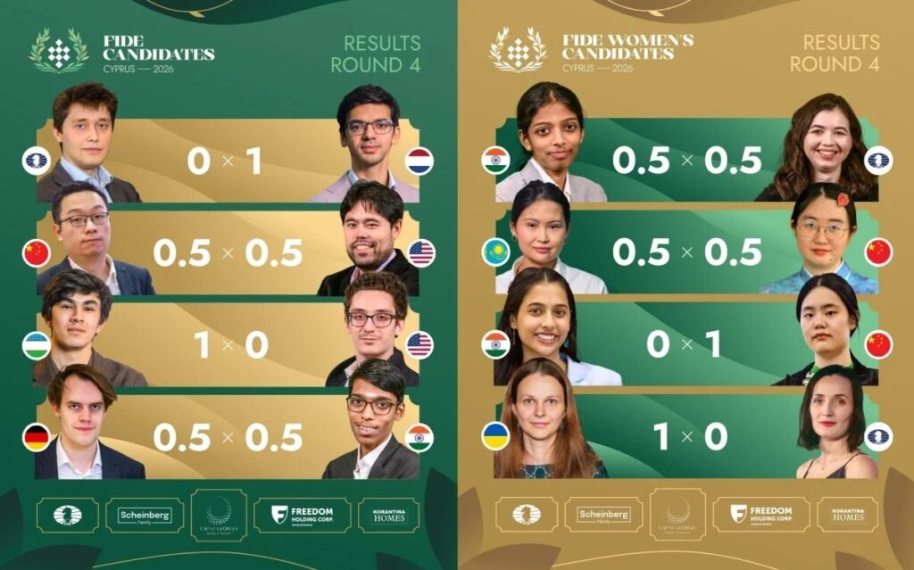 Am Ende gab es insgesamt vier entschiedene Partien vor dem Ruhetag. Der Usbeke Sindarov geht bereits mit einem Vorsprung von einem Punkt in die fünfte Runde. Bei den Frauen konnte sich noch keine Spielerin absetzen, aber mit der Nachrückerin Anna Muzychuk und der Kasachin Bibisara Assaubaeva, führen Spielerinnen das Feld an, die hier nicht als Duo (Indien, China, Russland) auftreten.