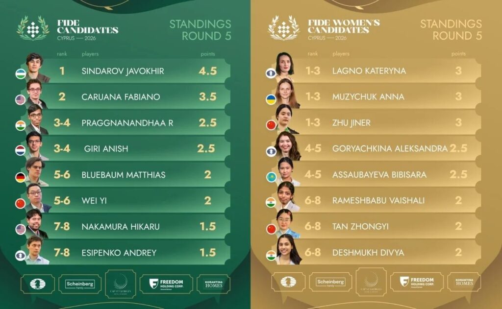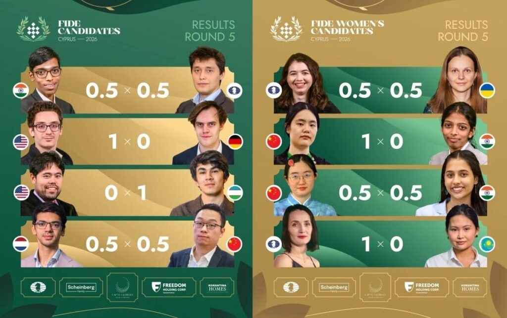 Während sich in der offenen Klasse zwei Spieler vom Feld absetzen konnten und das Feld auf fünf Punktegruppen (+4 bis -2) verteilt ist, liegen die Frauen noch näher beieinander und ein Sieg genügt für die Spielerinnen hinten im Feld, um wieder näher an die Spitze heranzurücken. Man kann vielleicht erste Tendenzen ausmachen, aber sicher keine Favoritin nach fünf Runden ausrufen. In der offenen Gruppe ist Javokhir Sindarov der zu schlagende Spieler und man kann sich auch von den bisherigen Auftritten der Spieler momentan nur noch Fabiano Caruana als anderen Spieler vorstellen, der das Turnier am Ende gewinnen könnte. Die Begegnung der beiden Spieler gegeneinander in der Rückrunde (Runde 11) könnte die Entscheidung bringen.