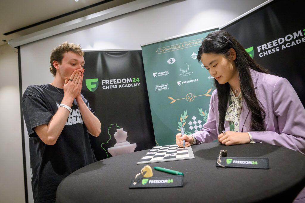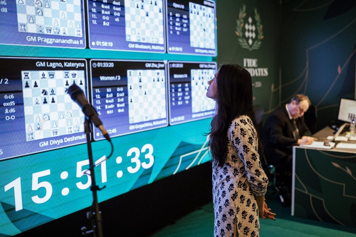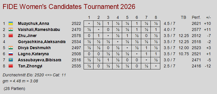 Wer die Partien ohne Kommentare nachspielen oder herunterladen möchte, der ist hier richtig. Die einzige entschiedene Partie wurde durch einen groben und völlig unnötigen Fehler entschieden. Tan leistete sich einen ihrer nicht untypischen Fehler, die man auch im letzten WM-Kampf gegen Ju Wenjun häufiger sah. Divya Deshmukh versuchte 135 Züge lang zu gewinnen. es gelang ihr nicht. Die Partie dauerte bis 21.45 Uhr Ortszeit, ging also über sechs Stunden.