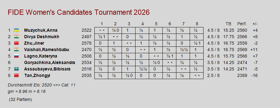 Wer die Partien ohne Kommentare nachspielen oder herunterladen möchte, der ist hier richtig. Die achte Runde hat das Feld erneut zusammengeführt. Der überraschende Gewinn der Inderin Divya gegen die Ukrainerin Anna Muzychuk war die Voraussetzung, dass jetzt fünf Spielerinnen auf dem geteilten ersten Platz stehen. Das dürfte Spannung versprechen.