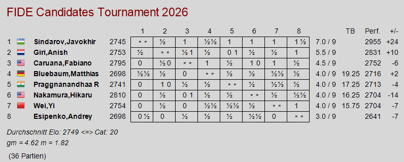 Wer die Partien ohne Kommentare nachspielen oder herunterladen möchte, der ist hier richtig. Die erste Chance, die Javokhir Sindarov im Turnier ausgelassen hat. Jedenfalls ließ er einen Damentausch gegen den Deutschen Matthias Blübaum zu und der konnte danach recht einfach Remis halten. Dafür gewann Anish Giri das Verfolgerduell gegen Fabiano Caruana und ist jetzt „nur“ noch anderthalb Punkte hintendran. Pragg verpasste einen vollen Punkt gegen den Chinesen Wei Yi.