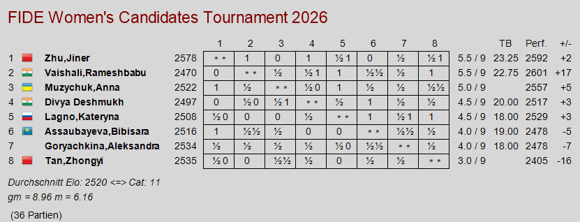 Wer die Partien ohne Kommentare nachspielen oder herunterladen möchte, der ist hier richtig. Die wichtigsten Siege gelangen der Chinesin Zhu Jiner gegen Kateryna Lagno und der Inderin Vaishali gegen Divya, also gegen direkte Konkurrentinnen. Anna Muzychuk verpasste erneut eine gute Chance und spielte nur Unentschieden.