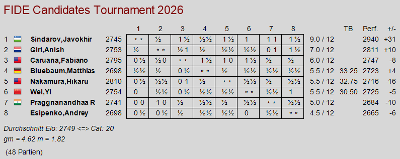 Wer die Partien ohne Kommentare nachspielen oder herunterladen möchte, der ist hier richtig. Die erste beendete Partie war heute die Begegnung zwischen dem Spitzenreiter Javokhir Sindarov und Hikaru Nakamura. Die beiden Spieler fanden schnell zueinander und beendeten die Partie nach 35 Minuten. Anish Giri spielt in der 13 Runde gegen den Usbeken Sindarov an und ein Sieg gegen den Chinesen Wei Yi war notwendig, um noch im Rennen zu bleiben. Der Niederländer verpasste seine Chance.