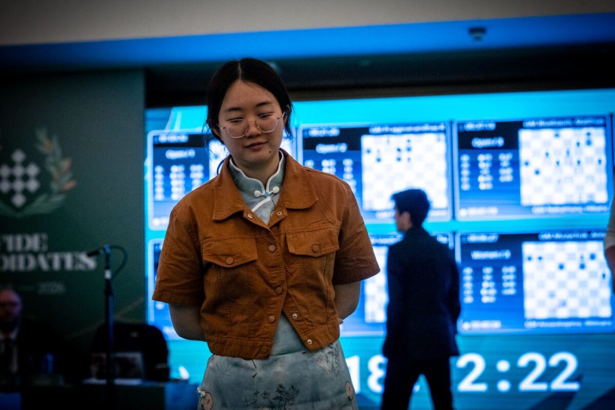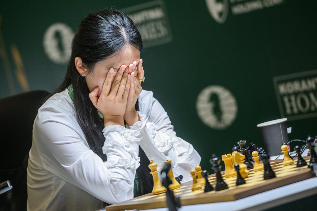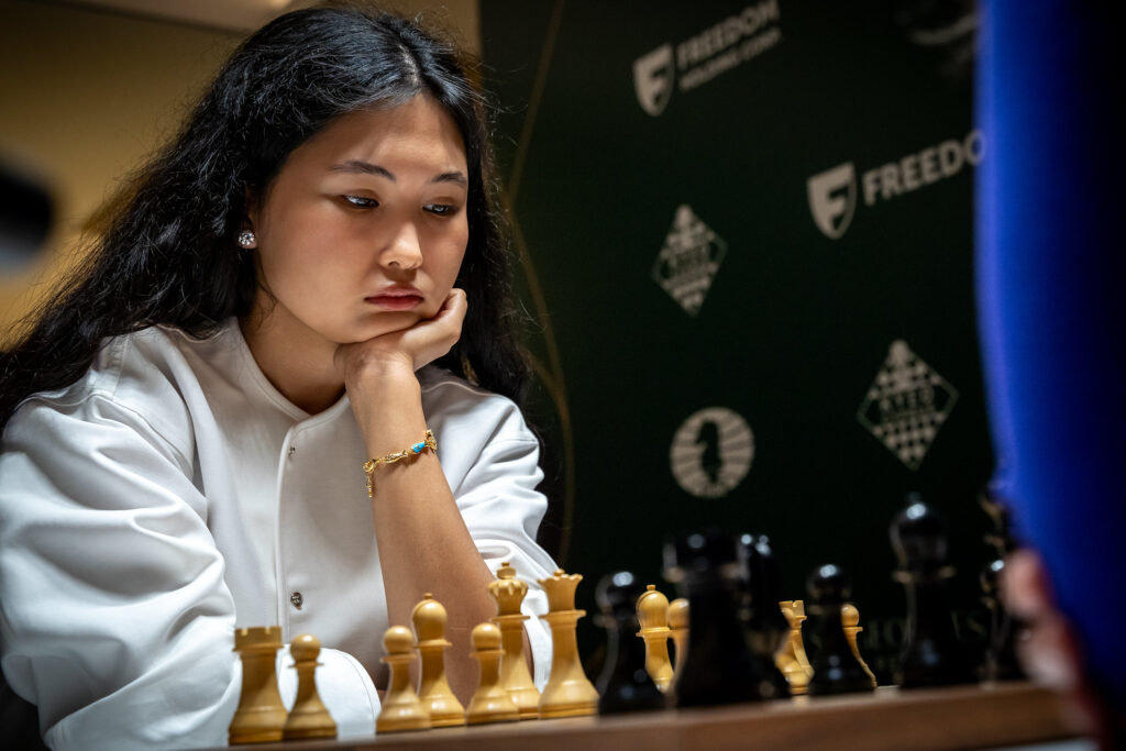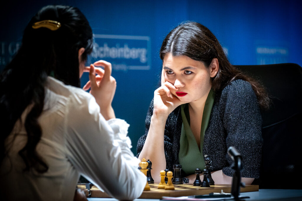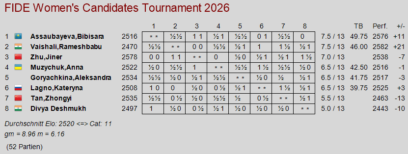 Wer die Partien ohne Kommentare nachspielen oder herunterladen möchte, der ist hier richtig. Vor allem die Spielerinnen mit Chancen und deren Partien hatten eine Bedeutung für den 13. Spieltag. Zunächst gewann die Kasachin Bibisara Assaubaeva ihre Partie gegen Anna Muzychuk aus einem besser stehenden Endspiel mit ungleichfarbigen Läufern heraus. Vaishali konnte ihre lange Zeit schlechter stehende Partie gegen Tan Zhongyi halten und im Verlauf etwas überraschend verlor Zhu Jiner ihre Partie gegen die Russin Aleksandra Goryachkina und liegt jetzt einen halben Zähler hinter den zwei führenden Spielerinnen.